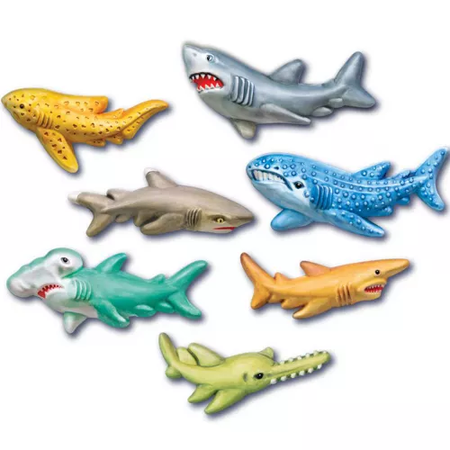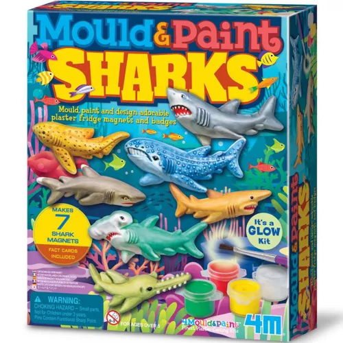Maak de vormpjes met gips in de mal en geef deze kleur na het uitharden. Ook heeft de set een zakje met glow in the dark verf om de haaien te laten stralen in het donker!