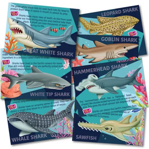 Met dit setje kunnen zeven verschillende haaien gemaakt worden: de witte haai, witpunthaai, walvishaai, hamerhaai, zaagvishaai, luipaardhaai en de koboldhaai.