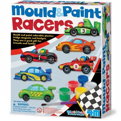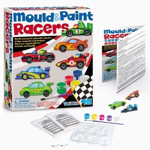 Creëer je eigen magneten of badge van raceauto’s, met dit knutselpakket ‘Mould & Paint Racers’ van het merk 4M.
