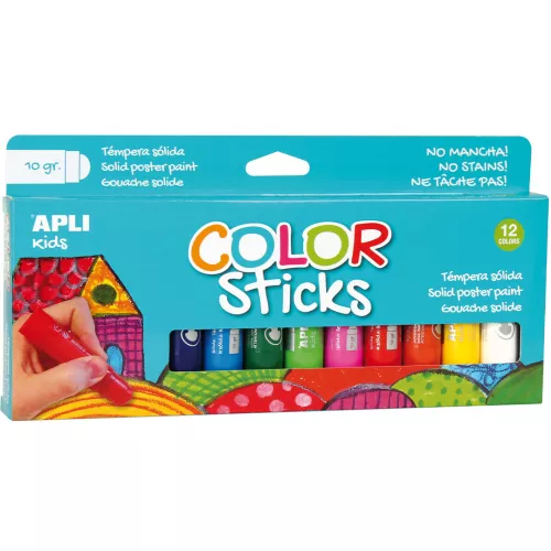 Maak bont gekleurde tekeningen met deze twaalf verschillende verfstiften ‘Color Sticks – 12’ van het Spaanse merk Apli Kids. De verf komt naar boven als er aan de stift wordt gedraaid.