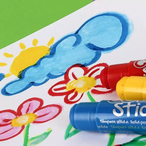 De stiften hebben de volgende kleuren: wit, geel, oranje, rood, roze, groen, donkergroen, blauw, donkerblauw, paars, bruin en zwart. Deze verfstiften maken het makkelijk om het huis netjes te houden terwijl de kinderen nog steeds hun creativiteit kunnen uiten. De verf droogt binnen drie minuten.