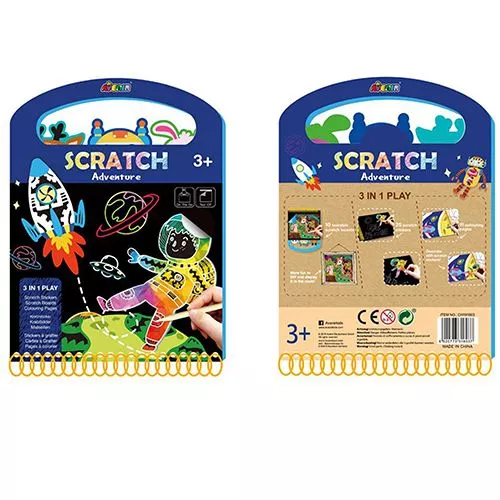 Een wonderlijke 3-in-1 krasset ‘Scratch Book – Adventure’ van het merk Avenir. Kras voorzichtig de zwarte laag weg en er verschijnt een kleurrijke print vol avontuur.