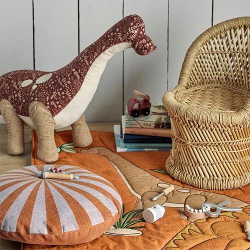 Deze grote, fleurige knuffeldino ‘Momo’ van het Deense merk Bloomingville vraagt erom helemaal omhelst te worden. Naast een heerlijke knuffelvriend is de dinoknuffel een decoratieve toevoeging in de speel- of kinderkamer op de bank of in bed.