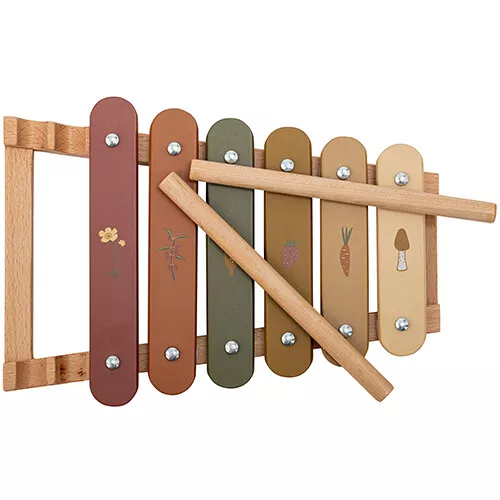 Een houten kinderxylofoon met zes klankstaven en een slagstok van het Deense merk Bloomingville voor een muzikale ontdekkingsreis.