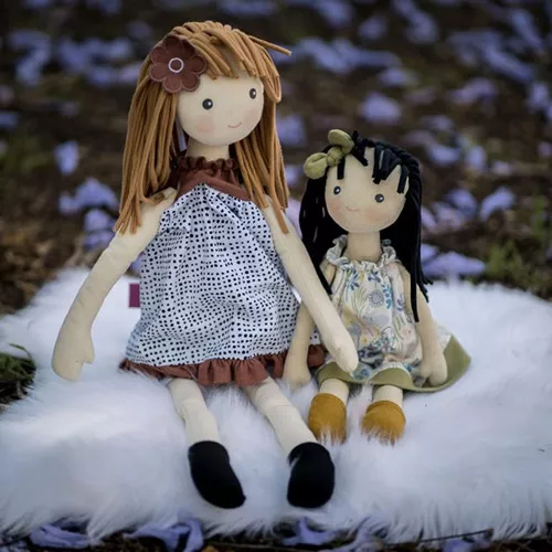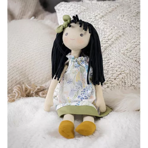 Deze stijlvolle lappenpop ‘Jedda’ uit de serie Chi-Chi van het merk Bonikka is in haar jurkje met lentepatroon en bijpassende haarstrik hartveroverend.