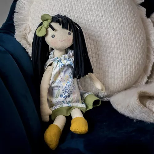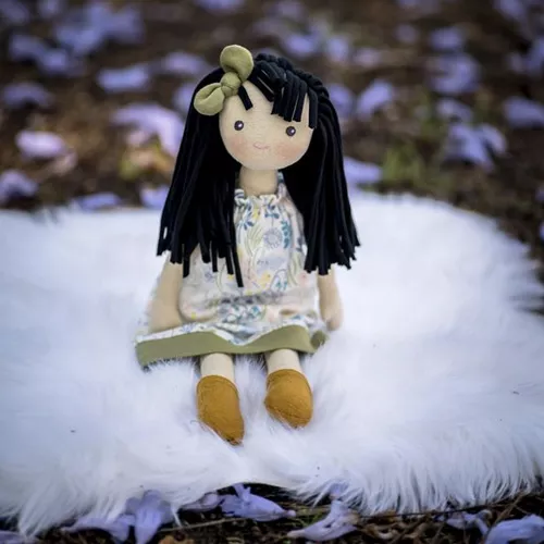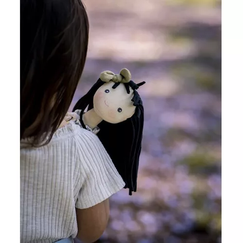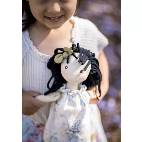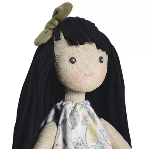 Met haar lange lijfje en haar snoet met blosjes heeft ze een lieve uitstraling. Ze heeft geborduurde oogjes. Haar lange zwarte haarbos van koord past perfect bij haar lente-outfit.