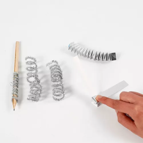 De robot heeft verende armen van stroken gevouwen papier en benen van chenilledraad. Geen hem en koptelefoon en ontwerp zelf zijn gezichtsuitdrukking.