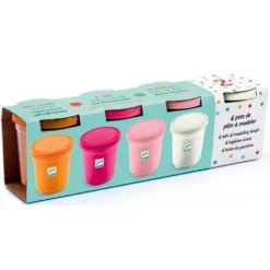 Een set met zachte boetseerklei van het Franse merk Djeco in de kleuren wit, lichtroze, roze en oranje. Een zoete kleurenmix om heerlijk in te kneden en vorm te geven.