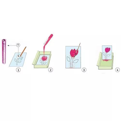 2. Verwijder vervolgens alle vakjes waar dit nummer op staat. Leg het schilderijtje in de doos en strooi de juiste kleur glitters over het geopende vakje. Het glitterzand blijft nu kleven op het lijmlaagje. Veeg met het kwastje het overtollige glitter van het schilderijtje.