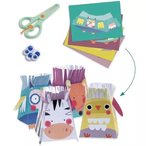 De knutselwerkjes bestaan uit dieren en een uitvouwbare prent versieren met stickers, een collage maken, kartonnen 3D figuren maken, grappige pennenhouders vouwen en lekker kleuren met waskrijt.