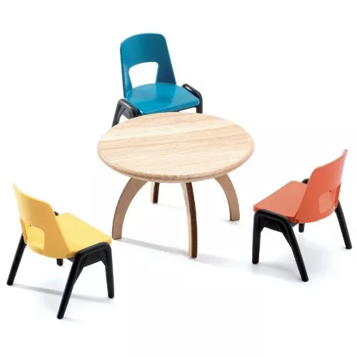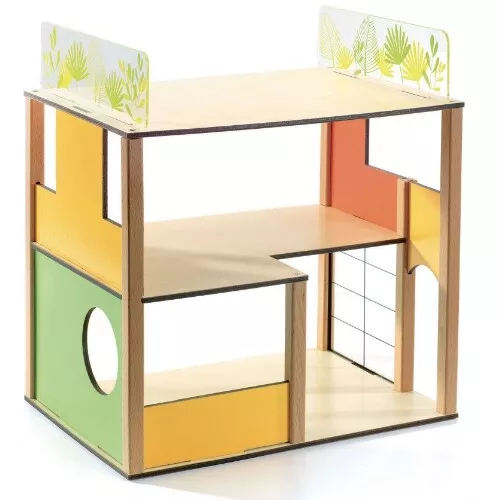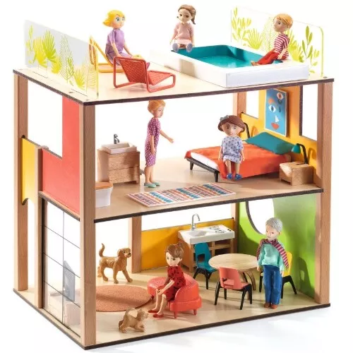 Het houten speelgoedhuis heeft diverse vertrekken, allen in verschillende en moderne kleuren. De begane grond bestaat uit een grote woonkamer met een comfortabele inloopkeuken. Op de eerste verdieping bevinden zich de slaap- en badkamer. De bovenste verdieping is een luxe dakterras voor de poppenhuisfamilie.