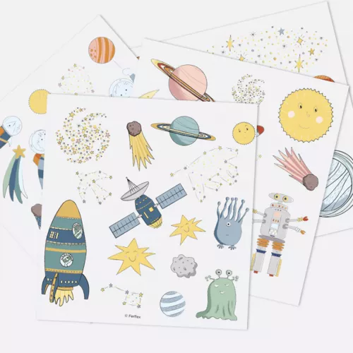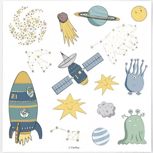 Ontdek de ruimte met de set van 49 magneten ‘Dans L’espace’ van het Franse merk Ferflex. Vlieg met een raket naar verre planeten, verken constellaties of ontmoet grappige ruimtewezentjes. Vrolijke magneten op een magneetbord of op de koelkast.