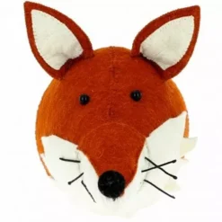 Deze vilten vossentronie in natuurgetrouwe kleuren – kastanjebruin en witte bef – heeft een spitse snuit met snuffelneus, twee gespitste oren, kraalogen en snorharen van ijzerdraad. Een aanwinst voor iedere kinderkamer, speelkamer of woonkamer. De wanddecoratie is eenvoudig aan de muur te bevestigen met een haak aan de achterzijde.