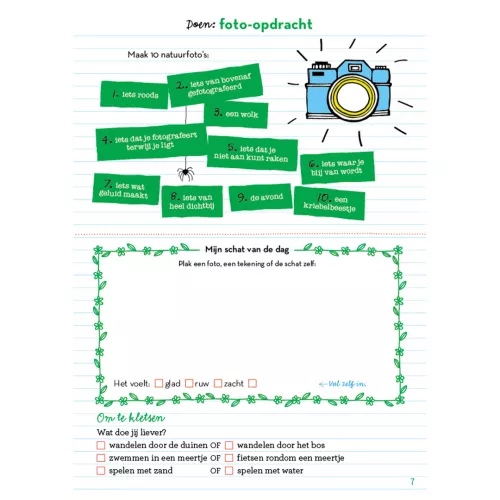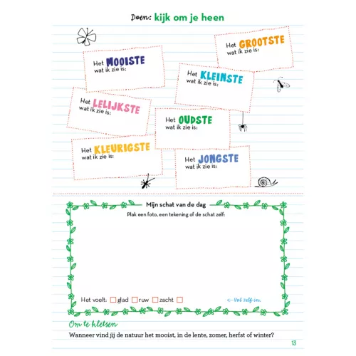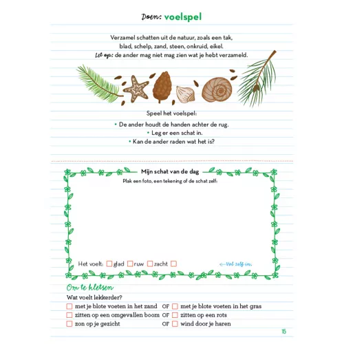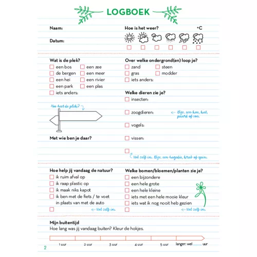 Op elke linkerpagina staat een logboek om in te vullen. Op welke plek ben je? Welke dieren, bomen, bloemen en planten zie je? Hoe lang was jouw buitentijd? Op elke rechterpagina is ruimte voor jouw ‘schat van de dag’. Ook staat er een opdracht en een vraag om nog even samen te kletsen.
