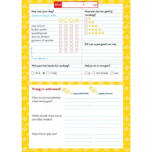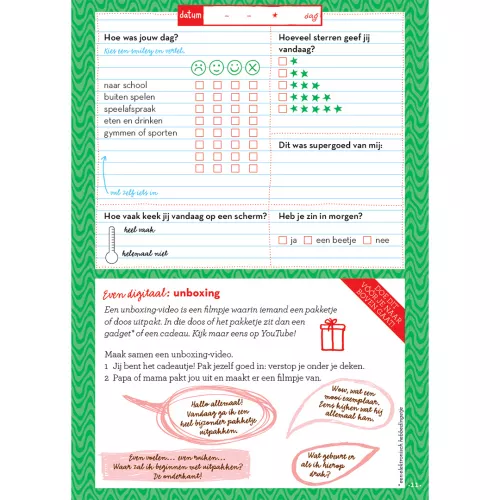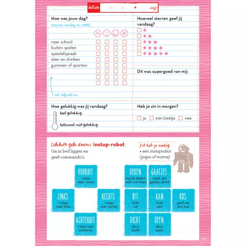 Voor kinderen is het prettig om de dag rustig af te bouwen met een vast ritueel. Ook voor volwassenen is het goed om de dag te verwerken voor het slapen gaan. Op iedere pagina maak je korte notities over de dag. Hoeveel sterren geef jij vandaag? Wat was supergoed van jou? Met elke dag een andere opdracht. Er zijn dilemma’s, mini-massages, dobbelopdrachten, gekke vragen, tekenopdrachten, opdrachten met cijfers en letters en opdrachten waarbij je een telefoon of tablet nodig hebt.