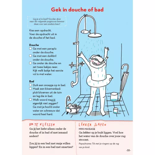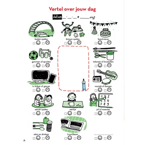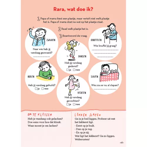 Iedere linkerpagina bevat dezelfde dagboekplaatjes: kies een of meer situaties en laat de kleuter vertellen. ‘Heb je vandaag gedanst? Buiten gespeeld of een werkje gedaan? Werd je daar blij van, of misschien verdrietig of boos?’ De rechterpagina is steeds anders: een kort spelletje, een of twee kletsvragen en een rustige afsluiter, zoals minimassages.