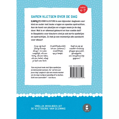 Een dagboek voor het slapengaan ‘Slaapklets voor kleuters – Deel 1’ van het Nederlandse merk Gezinnig. Een fijn boek om de dag door te nemen en even de volle aandacht van mama of papa te krijgen. Met behulp van plaatjes en vragen kunnen ouders de dag van de kleuter doornemen. Wat is er allemaal gebeurd en hoe voelde dat?