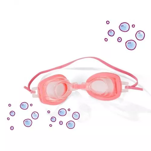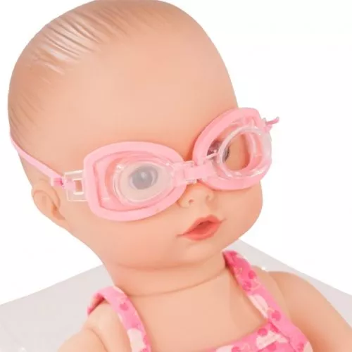 Als de pop wil zwemmen en geen water in haar ogen krijgen, dan komt deze roze poppenduikbril ‘Goggles Sarah’ van het Duitse merk Götz goed van pas. Een spectaculair gezicht.