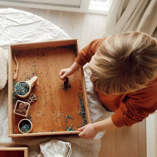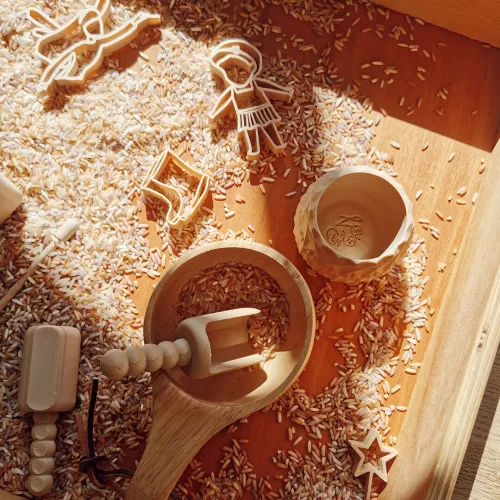 De rijst voelt fijn aan voor kinderhanden en het scheppen en gieten van de rijstkorreltjes geeft daarnaast een rustgevend geluid. Spelen met speelrijst helpt kinderen om prikkels te verwerken en te ontspannen en is goed voor de ontwikkeling van de sensomotoriek.
