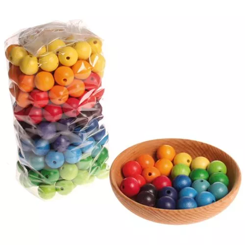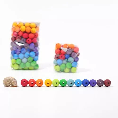 Houten kralen in de 12 kleuren van de regenboog van het Duitse merk Grimm’s. Kralen zijn elementair speelgoed voor kinderen. Het rijgen is een nauwkeurig werkje en stimuleert de oog-hand coördinatie en motoriek. Met de prachtige kleuren kunnen allerlei combinaties gemaakt worden.