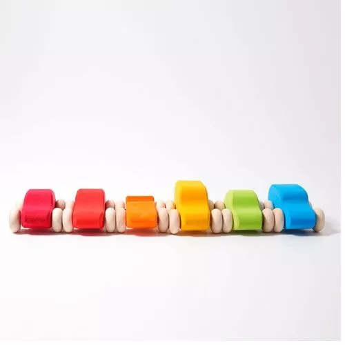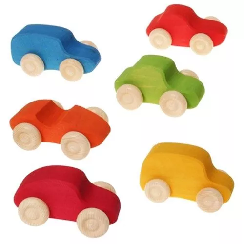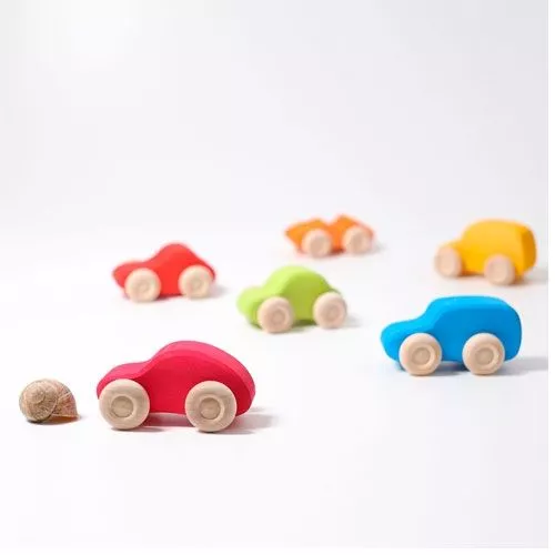 Een set van zes verschillende kleine, houten autootjes van het Duitse merk Grimm’s. Twee personenauto’s, twee bestelbusjes, twee raceauto’s, elk in een verschillend model en kleur. Speelgoed waarmee het wagenpark meteen compleet is en ook mooi te combineren is met ander speelgoed.