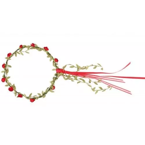 De bloemenhaarkrans is afgewerkt met effen rode linten en linten van bloemblaadjes.