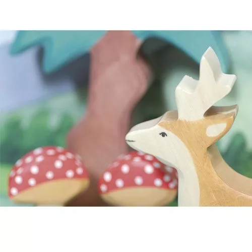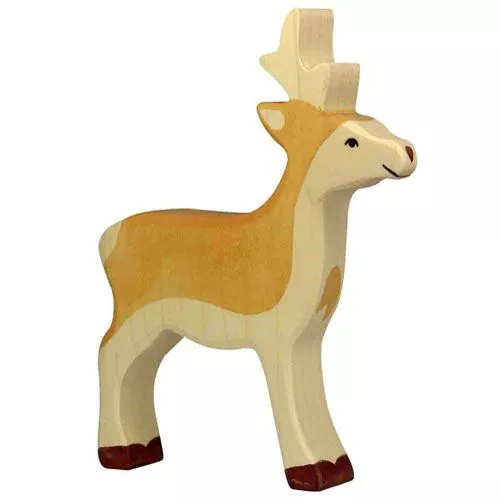 Een houten reebok met gewei uit de bosdieren serie van het Duitse merk Holztiger. Dit speelgoed hert met afgeronde hoeken ligt prettig in kinderhanden.