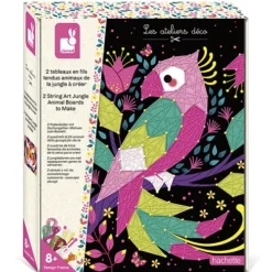 Met gekleurd garen en kunststof spijkertjes brengen kinderen de dieren van de jungle tot leven. Deze ‘String-Art – Jungle’ knutselset uit de ‘Les Ateliers Déco’ collectie van het Franse merk Janod bevat twee dierenprenten, waar kunststof spijkers in geplaatst kunnen worden. Span de draden eromheen en er ontstaan verrassende kunstwerken.