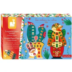 Met decoratieve papieren stroken worden de grappige dieren aangekleed met dit knutselpakket ‘Braided Paper Flaps – Funny Animals’ van het Franse merk Janod.