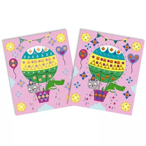 De vrolijke kaarten zijn eenvoudig te versieren met de de zelfklevende decoratiesteentjes en stickers. Door het juiste steentje bij het juiste vakje te zoeken, ontstaan prachtige kunstwerkjes.