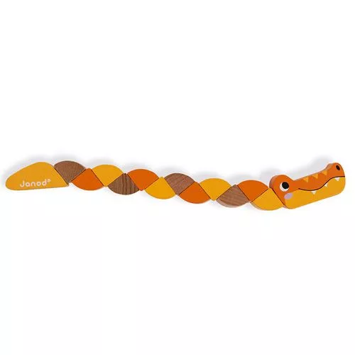 Een houten krokodil van het Franse merk Janod, die kronkelt. Een beetje magisch.