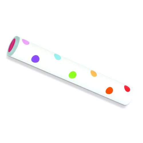 Een vrolijk kindermuziekinstrument, uitgevoerd in wit met gekleurde stippen.