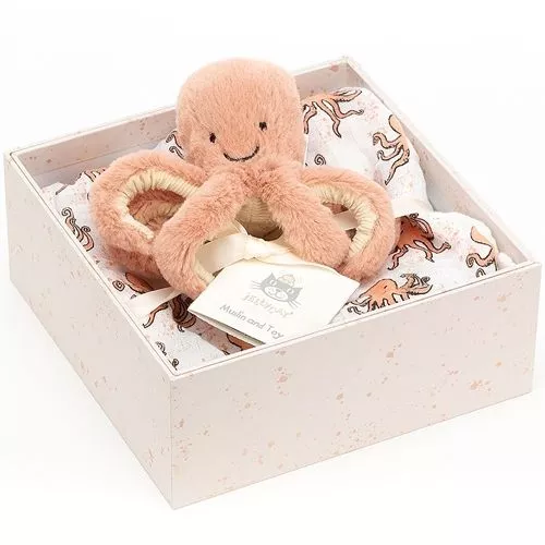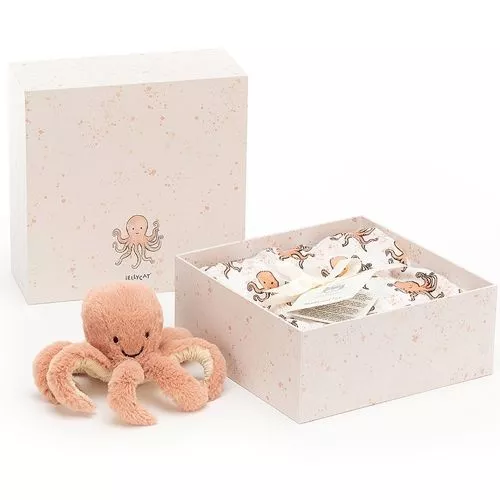 Een mooie cadeauset ‘Odell Octopus’ van het Engelse merk Jellycat met een hydrofieldoek en een onweerstaanbaar octopusknuffeltje. Het knuffeltje heeft geborduurde oogjes en een luxe fluweelzachte vacht met armen van corduroy.