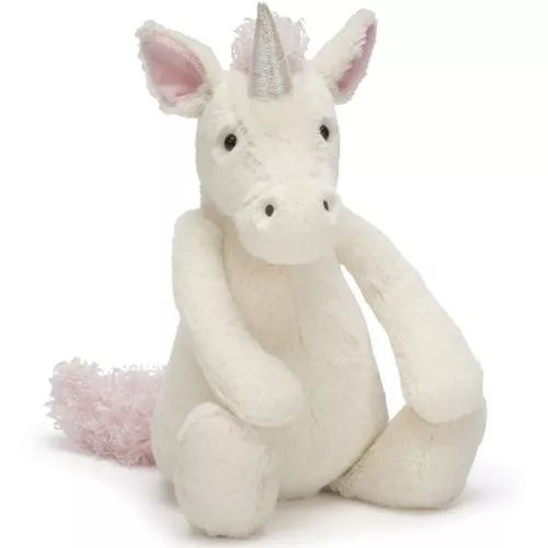 Bashful Unicorn pink van het Engelse merk Jellycat is een melkwit magisch knuffelpaard en heeft een roze glanzende hoorn, roze oortjes en roze gekrulde manen en staart. Deze speelgoedeenhoorn met kraaloogjes, heeft een luxe fluweelzachte melkwitte vacht en flinke pluisstaart en is een knuffel om te knuffelen en om altijd bij de hand te hebben. Zijn lange slappe armen zijn gemakkelijk vast te houden.