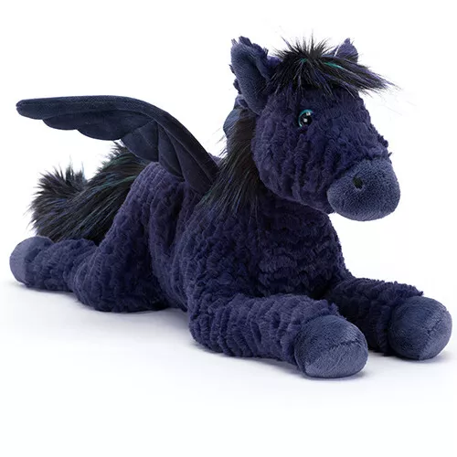 Dit gevleugde knuffelpaard ‘Seraphina Pegasus’ van het Engelse merk Jellycat ligt prachtig te pronken met zijn zachte vacht in golvende lijnen, flinke, pluizige staart en manen en glanzende hoeven. Met zijn zwarte kraalogen, vriendelijke snuit en inktblauwe vacht is deze mythische paardenknuffel onweerstaanbaar.