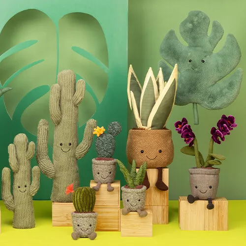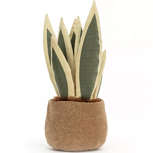 Ook zonder groene vingers kan deze, flink uit de kluiten gewassen, knuffelsanseveria ‘Amuseable Snake Plant’ van het Engelse merk Jellycat met een gerust hart in huis gehaald worden. De knuffelplant heeft weinig verzorging nodig en gedijt goed bij een paar knuffels per dag.