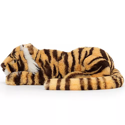 Met een prachtig strepenpatroon en pluizige bakkerbaarden is deze relaxte tijger ‘Taylor Tiger Little’ van het Engelse merk Jellycat een knuffelmaatje om te vertroetelen. De vacht van de tijgerknuffel is onweerstaanbaar zacht en aan zijn poten en staart kan hij gemakkelijk opgepakt worden.
