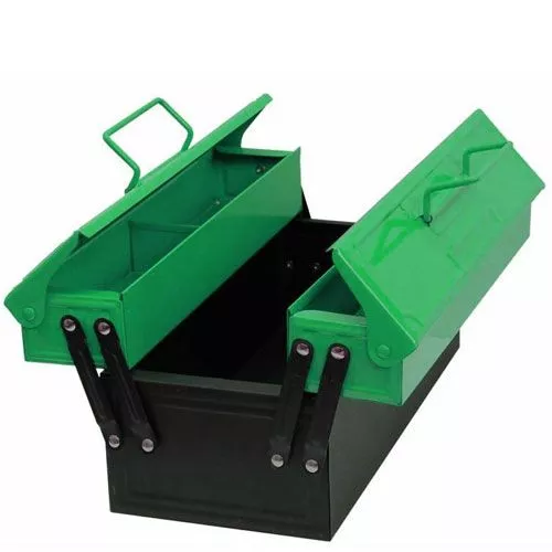 De kindergereedschapskist heeft een grote bak met daar bovenop 2 uitklapbare laden met 2 vakken voor het kleinere goed.