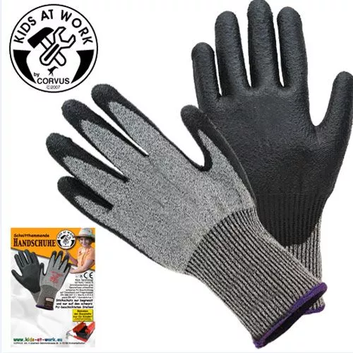 Een paar snijbeschermende werkhandschoenen maat 8/L voor de leeftijd van 12-14 jaar uit de serie Kids-at-Work van het Duitse speelgoedmerk Corvus.