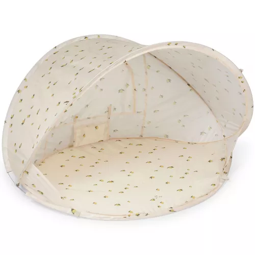 Deze uv-strandtent ‘Lemon’ van het Deense merk Konges Sløjd biedt bescherming tegen felle zon en frisse wind.