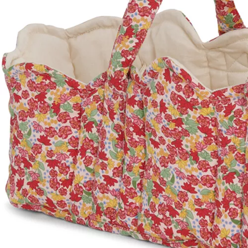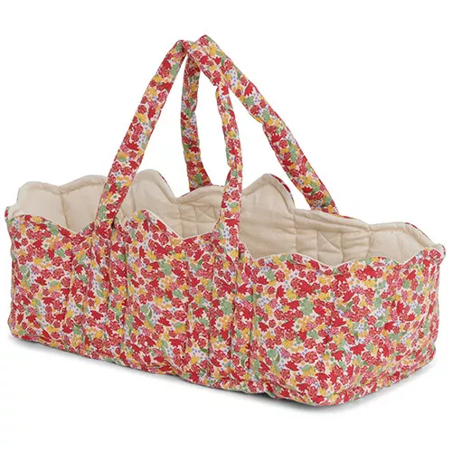 De gewatteerde reiswieg heeft geschulpte randen, een fleurig bloemendessin en is voorzien van twee hengsels.