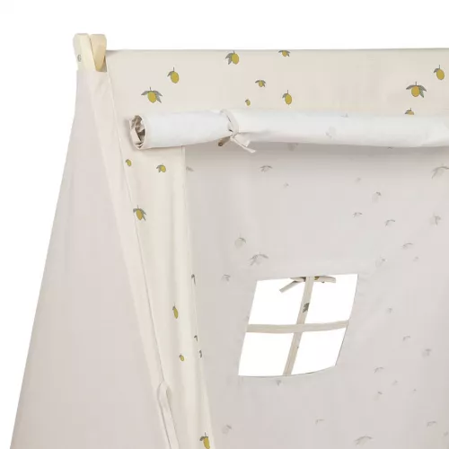 Deze speeltent ‘Lemon’ van het Deense merk Konges Sløjd biedt kinderen een heerlijk knus plekje om in te schuilen, spelen, lezen en ontspannen. Het speelhuisje bestaat uit een houten frame en een katoenen tentdoek met een dessin van citroentjes.