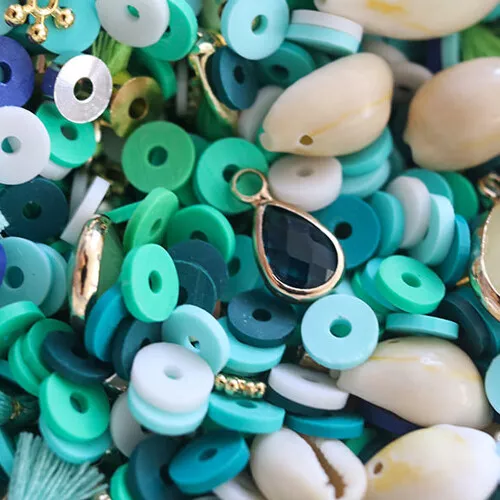 Een mix van Heishi-kralen en verschillende bedels ‘Bali’ van het Franse merk La Petite Épicerie voor het creëren van trendy armbanden of kettingen.