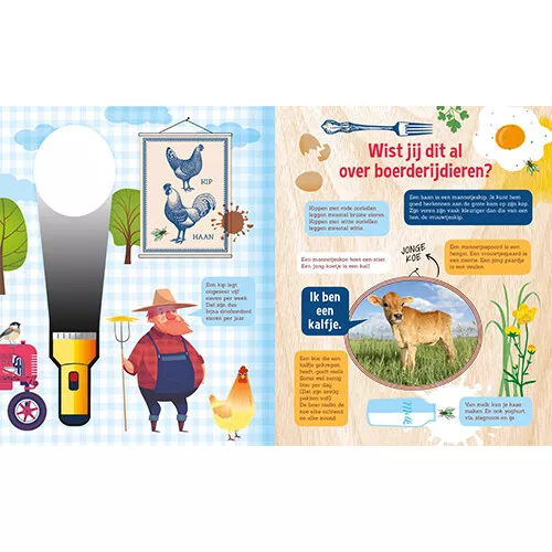 Met de zaklamp kan er samen gezocht worden naar de afgebeelde dikgedrukte woorden. Zo lees je samen interactief een boek.