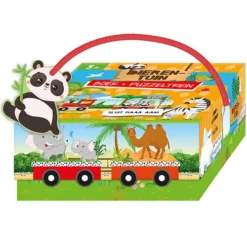 Ga je gezellig mee met de trein? Spring samen met de dieren uit de dierentuin aan boord! Leg de puzzelstukken aan elkaar om de hele trein te maken. Een boek boordevol dieren om te zoeken en leuk rijmpjes om voor te lezen!