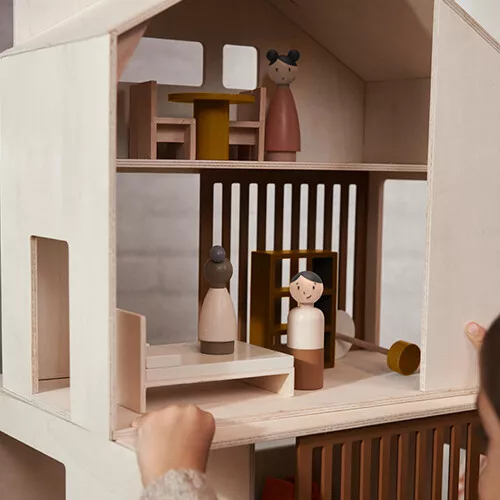 De poppenhuisfamilie bestaat uit vader en moeder en twee kinderen. De poppenhuispoppen hebben zachte kleuren en vriendelijke gezichten. Moeder en dochter hebben speelse knotjes.