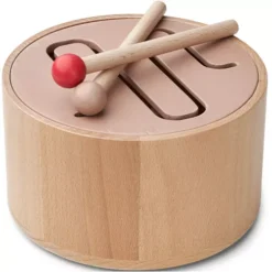 Een houten, mini speelgoedtrommel ‘Pete Drum – Tuscany Rose / Apple Red Mix’ van het Deense merk Liewood waarmee de kleine muzikant aan de slag kan. Door de twee drumstokken kunnen kinderen naar hartenlust muziek maken.