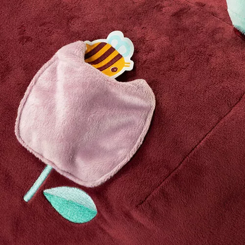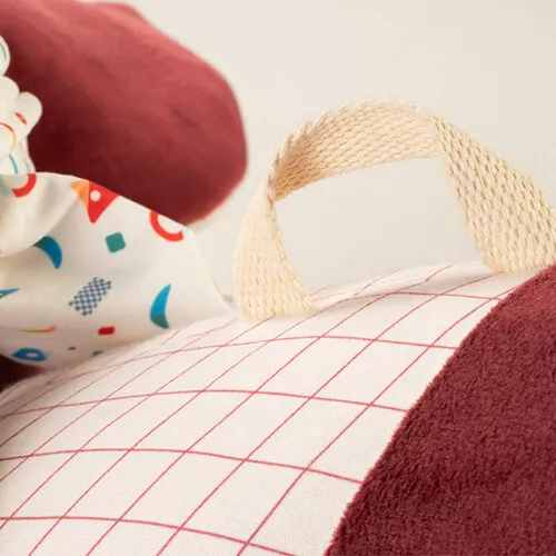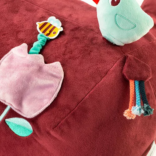 Het babyspeelgoed bevat knisperende oren om aan te frummelen, een spiegeltje en een rammelend vogeltje. En in haar grote koeiensnuit worden kleine schatten veilig bewaard. Of doe er een pyjama in als ze mee gaat logeren.