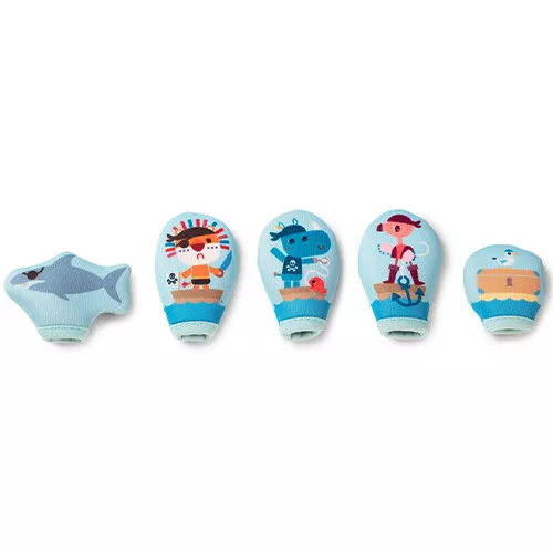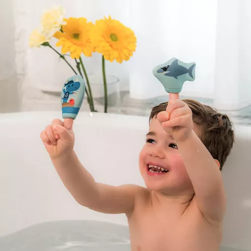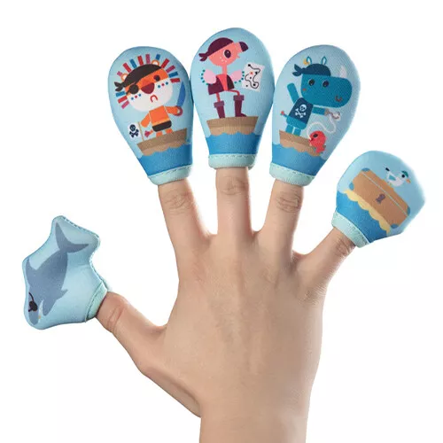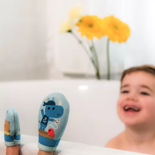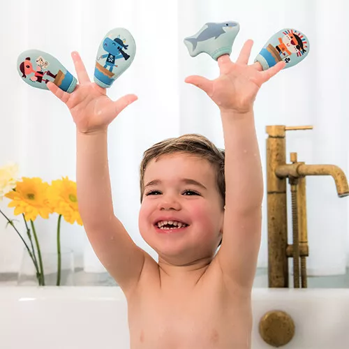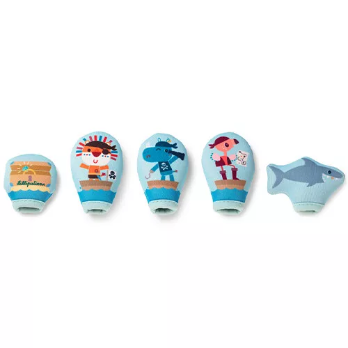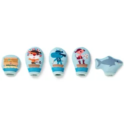 Vrolijke avonturen in bad met deze vijf vingerpoppetjes ‘Piraten’ van het Belgische merk Lilliputiens. Het badspeelgoed bestaat uit drie piraten, een schatkist en een haai.