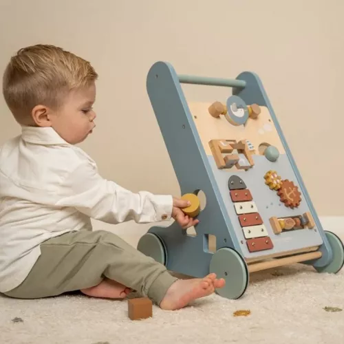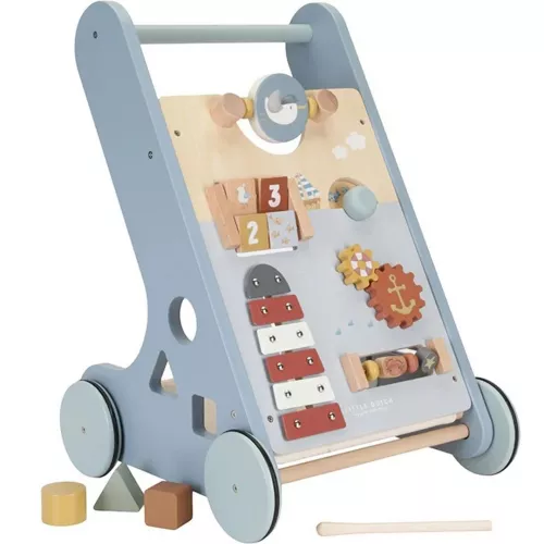 Een vrolijke multi-activiteitentrolley ‘Sailors Bay’ van het Nederlandse merk Little Dutch voor het oefenen van de eerste stapjes. Dit verrijdbare houten speelgoedwagentje heeft acht ingebouwde speeltjes. Als de beentjes moe worden van het lopen, kan de kleine zich hiermee vermaken.